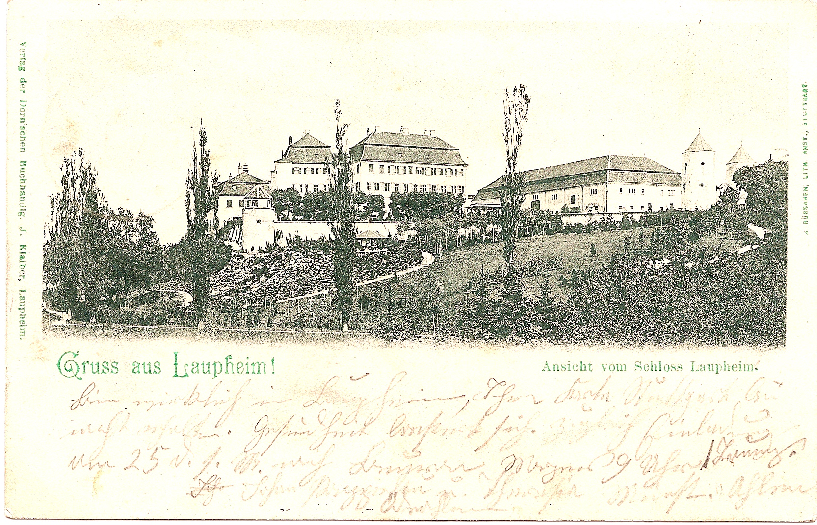 Auf dieser Karte von 1902 erkennt man deutlich die vier Teile der Schlossanlage „Großlaupheim“.- Links steht das „Kleine Schlössle“, das in der Mitte des 18. Jahrhunderts als Witwensitz errichtet wurde. Später diente es als Vogtei und ab 1965 als Heimatmuseum. In den sechziger Jahren war dort auch das Standesamt untergebracht.