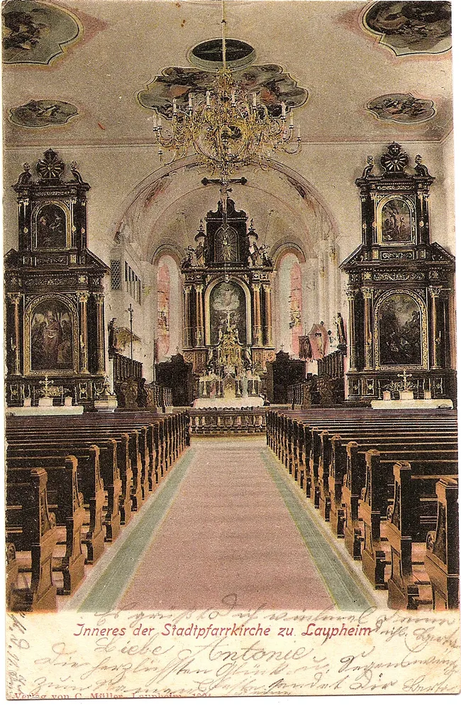 Für die Transkription dieser Karte vielen Dank an Mario Joestel. Hinweis: Die Karte ist fortlaufend transkribiert, der Text wechselt aber zweimal von der Bildseite auf die Adreßseite wieder auf die Bildseite. Text beginnend unter der Bildunterschrift "Inneres der Stadtpfarrkirche zu Laupheim"