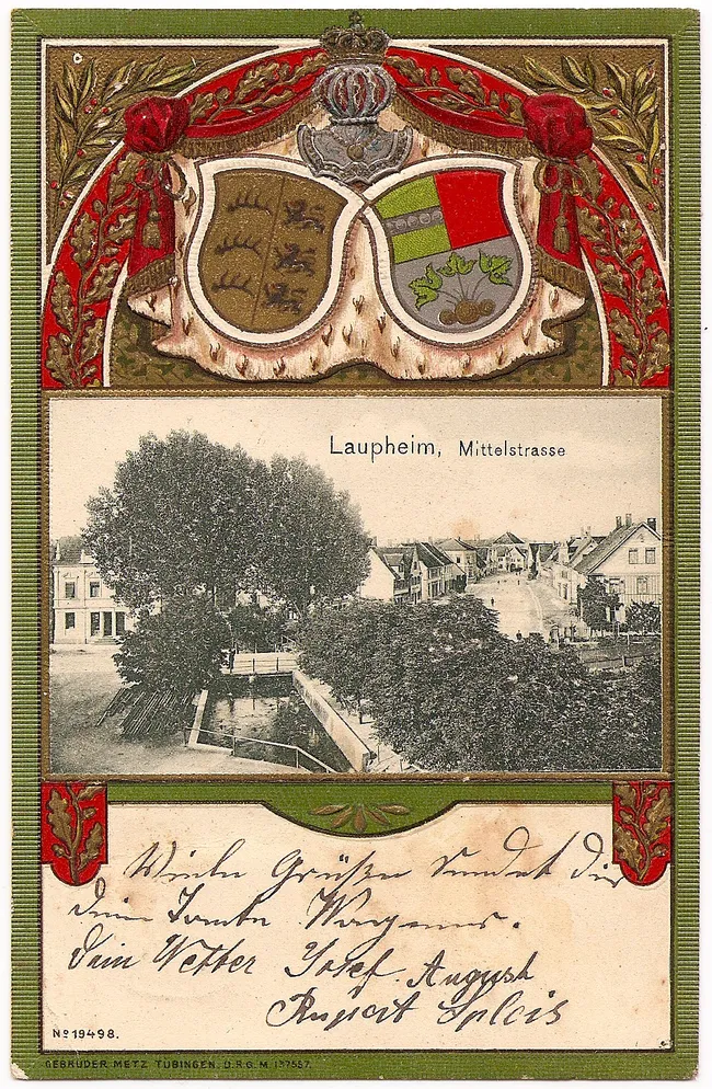 Der Laubach floss 1902 offen durch den Marktplatz. Bei den abgebildeten Wappen handelt es sich um das Württemberger und das Laupheimer Wappen.