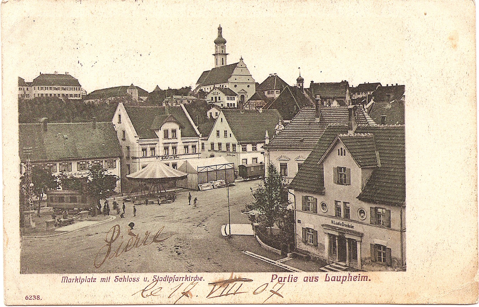 Hinter dem Karussell erkennt man das Gasthaus zum Pflug, das 1983 dem Neubau der Volksbank weichen musste. Links davon (hinter den Kastanien) war die Eisenhandlung Schuler, später die Flaschnerei und das Haushaltswarengeschäft Rupf. Auch dieses Haus gibt es nicht mehr. Die Rats-Apotheke und das G-Center wurden an dieser Stelle errichtet.