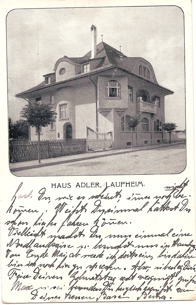 Die Postkarte wurde am 6. April 1907 von Friedrich Adlers Braut Berta Heymann (Heirat am 21. Mai 1907) an ihren Cousin Louis Mayer in St.Gallen geschrieben, kurz bevor das Paar nach Hamburg übersiedelte.