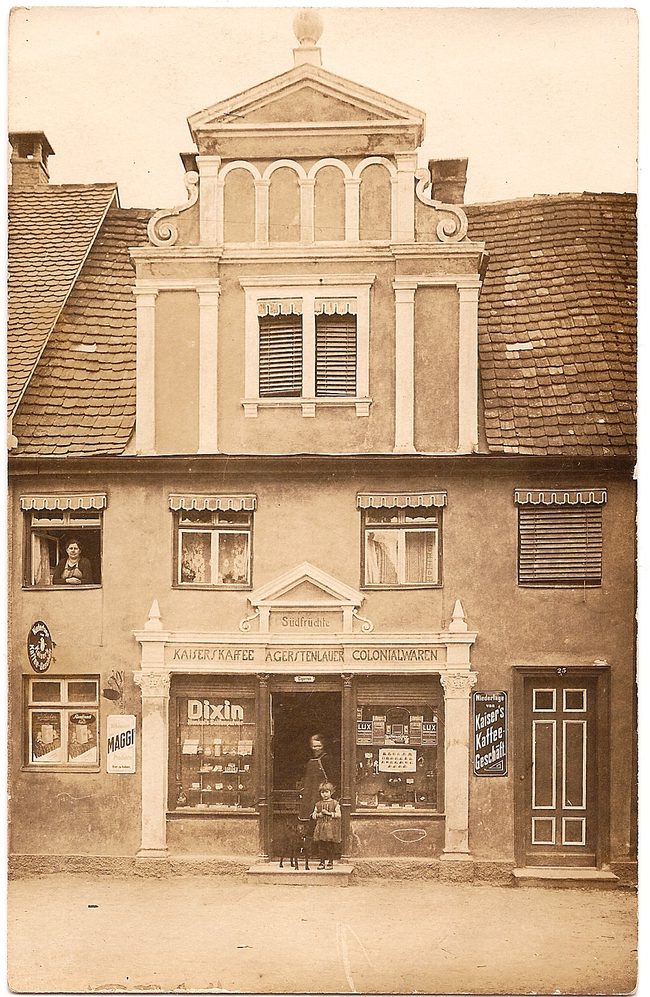 Am 1. Mai 1912 eröffnete Anna Gerstenlauer in der Mittelstraße ein Ladengeschäft für „Südfrüchte, Kaisers Kaffee und Colonialwaren“. Weil die Kinder hier auch für Pfennigbeträge Süßigkeiten erhielten, bekam sie den Namen „Pfennigweible“. Diesen Namen erbte auch ihre Tochter Klara, die ihr im Geschäft nachfolgte. Die originale Ladeneinrichtung ist im Depot des Heimatmuseums.