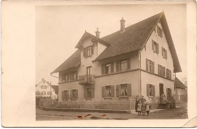 Die Postkarte zeigt das Wohnhaus des Bauunternehmers Josef Rupf am heutigen Germania-Kreisel vor dem Umbau (etwa 1910). Links erkennt man einen Teil der dort gelagerten Baumaterialien.
