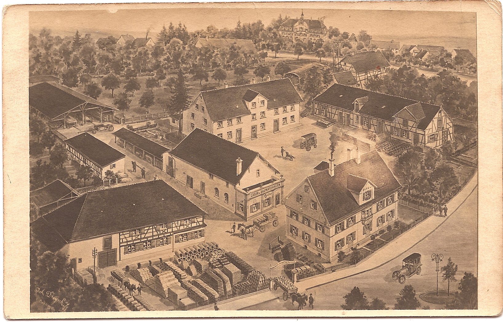 Hier sieht man eine Gesamtaufnahme des Geländes der ehemaligen Baufirma Josef Rupf. Das Wohnhaus wurde 1912 umgebaut und erhielt u.a. einen schmucken Erker. Auf dem Firmengelände stehen mehrere Gebäude (Gesindehaus, Stallungen...). Auch der riesige Obstgarten gehörte zum Eigentum der Firma.