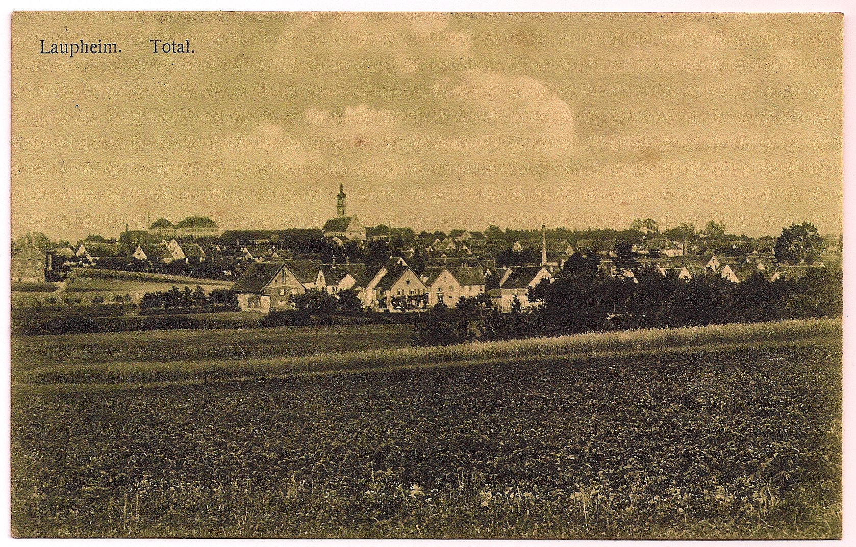 Bei dieser Karte von 1913 mit dem Titel "Laupheim / Total" blickt man von der Anhöhe bei der Bibri auf Laupheim.