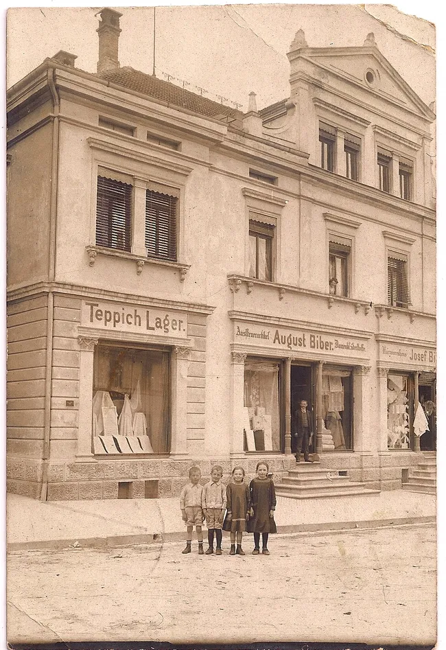 Auf der Ansichtskarte von 1911 erkennt man zwei Ladengeschäfte, die nicht nur ein ähnliches Sortiment haben (Aussteuerartikel, Damenkleiderstoffe, Kurzwaren...), sondern auch den gleichen Familiennamen: August Biber und Josef Biber. In Laupheim gab es noch zwei Textilgeschäfte mit dem Namen „Biber“: Karl Biber am Rathaus (heute: Esprit-Laden) und Witwe Berta Biber (heute Elsa Stetter/Mode und Design) beim Roten Ochsen.