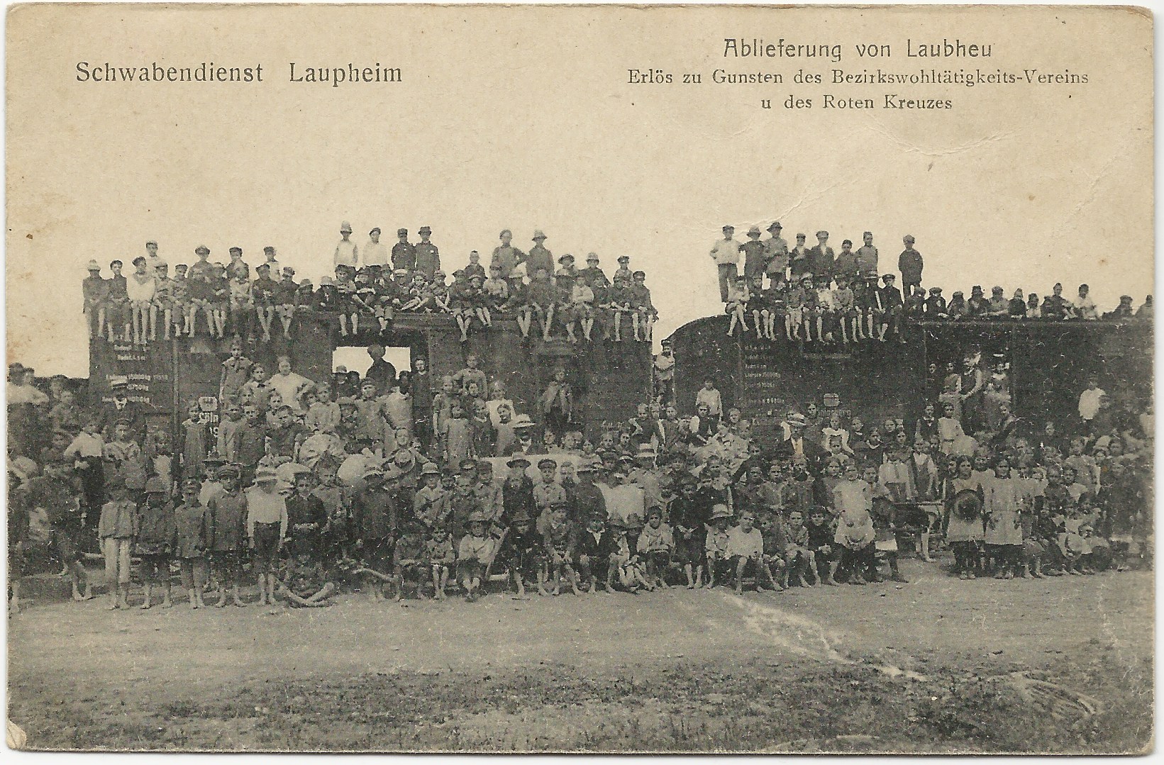 Auf der Karte steht:"Ablieferung von Laubheu / Erlös zu Gunsten des Bezirkswohltätigkeits-Vereins u. des Roten Kreuzes.