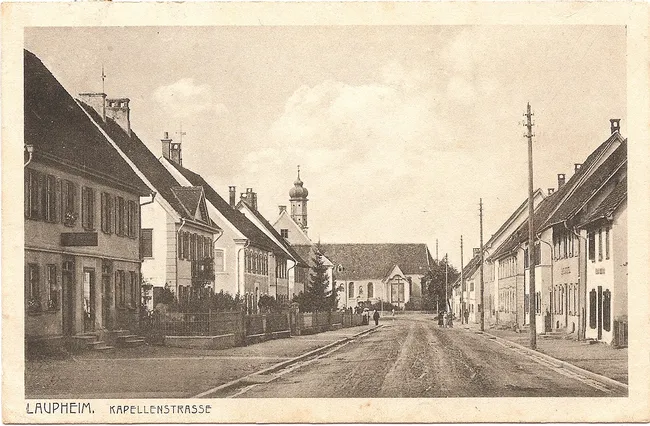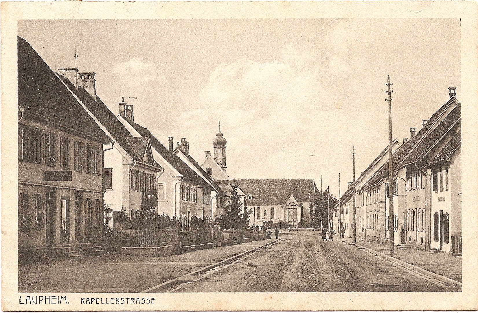 Links im Vordergrund ist die ehemalige Bäckerei Burkert zu erkennen (seit 2000 geschlossen). 1924 ist die Kapellenstraße noch nicht geteert.