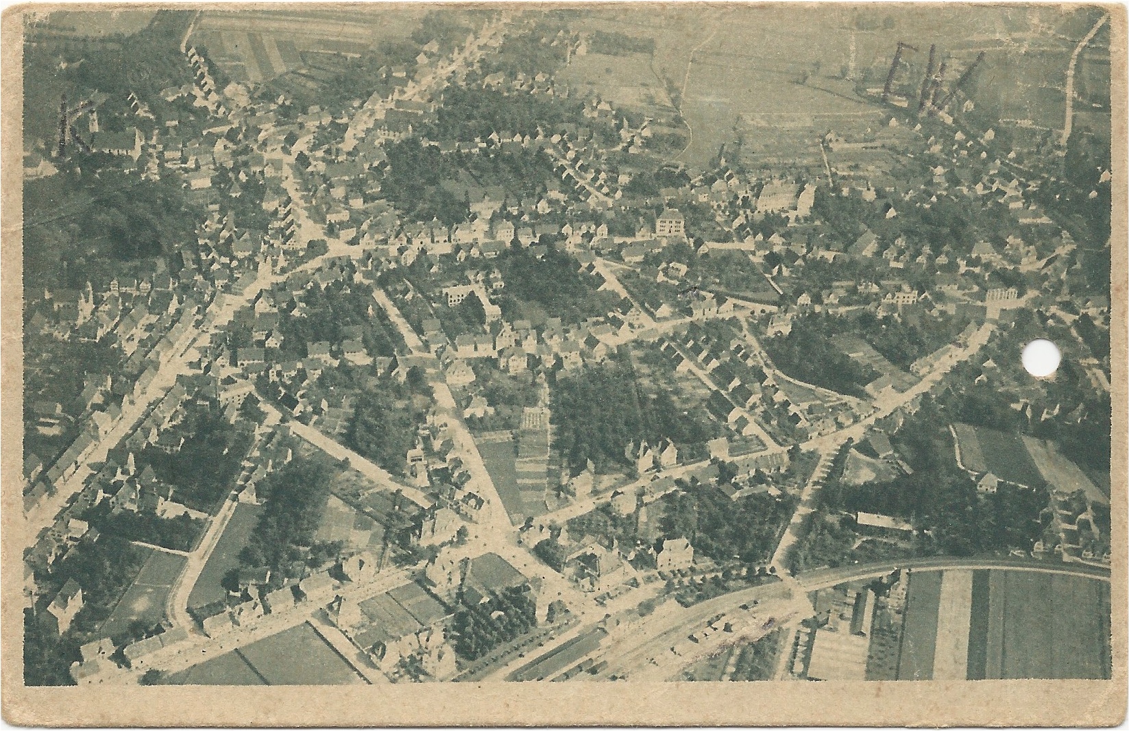 Die Karte ist gelocht. Wenn man sie umdreht, erkennt man den Grund. In den Zwanzigerjahren wurden Werbeaktionen für das Laupheimer Kinder- und Heimatfest veranstaltet.