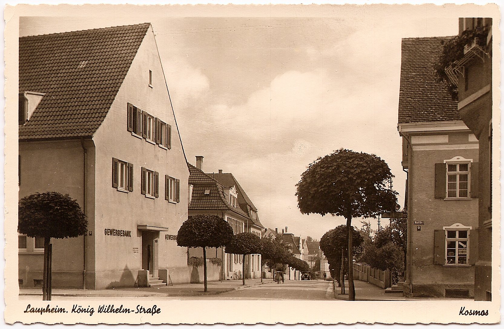 Der Fotograf blickt von der Kreuzung König-Wilhelm-Straße / Radstraße in Richtung Marktplatz. Die Gewerbebank im linken Haus wurde später in Volksbank umbenannt. 1982 riss man das "Gasthaus zum Pflug" am Marktplatz ab und errichtete an dieser Stelle das neue Volksbankhaus.
