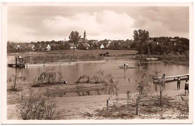 Dieses Foto wurde im Sommer 1935 aufgenommen. Büsche und Bäume sind erst vor einem knappen Jahr gepflanzt worden. Im Hintergrund – am Rand des Schwimmbades – erblickt man eine Holzhütte. Das war die erste Laupheimer Sauna.