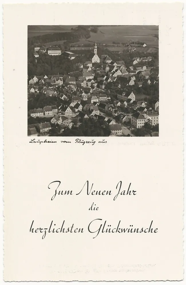 Die vorliegende Ansichtskarte zeigt das Zentrum von Laupheim am 19. 12. 1936. Die Aufnahme stammt von dem Schorndorfer Flugpionier Paul Strähle. Der ehemalige Jagdflieger begann ab 1919 mit der Herstellung von Luftbildern von ganz Deutschland. Sein Archiv mit gestochen scharfen schwarz-weiß Aufnahmen umfasste über 40 000 Bilder. Die Nazis verboten 1938 die Herstellung von Luftbildern durch Paul Strähle. Seit 1955 bis heute führen die Nachfolger die Herstellung von Luftbildaufnahmen weiter. Mai 2024