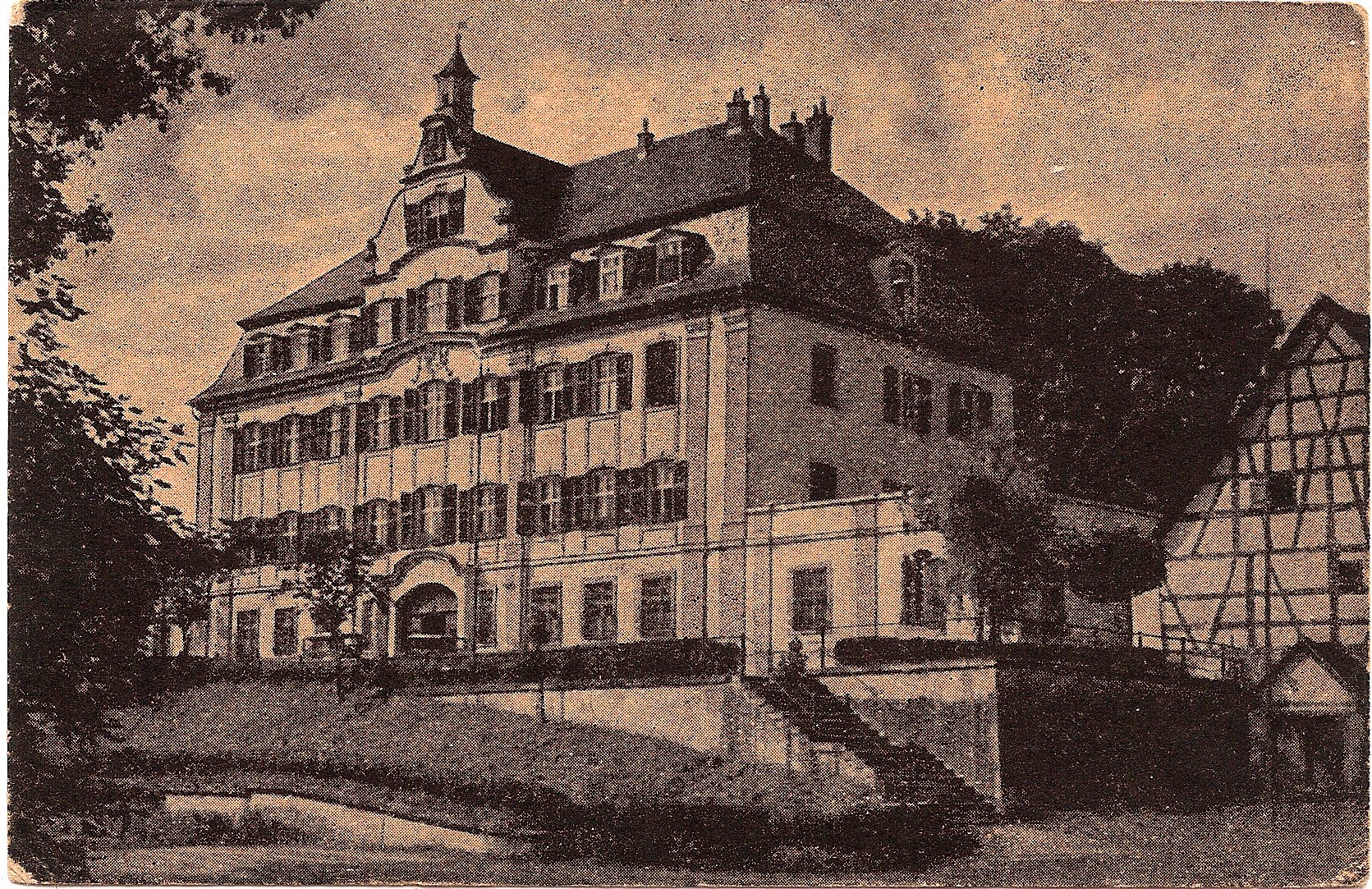 Diese Karte von Schloss Kleinlaupheim ist mitten im 2. Weltkrieg entstanden. Fotopapier war damals knapp. Der Hersteller der Ansichtskarte (A. Berger, Laupheim) nahm ein schon vorhandenes Motiv und druckte es auf dünne, dunkle, etwas gelbliche Pappe. Deshalb machen alle derartigen Postkarten einen ziemlich düsteren Eindruck.