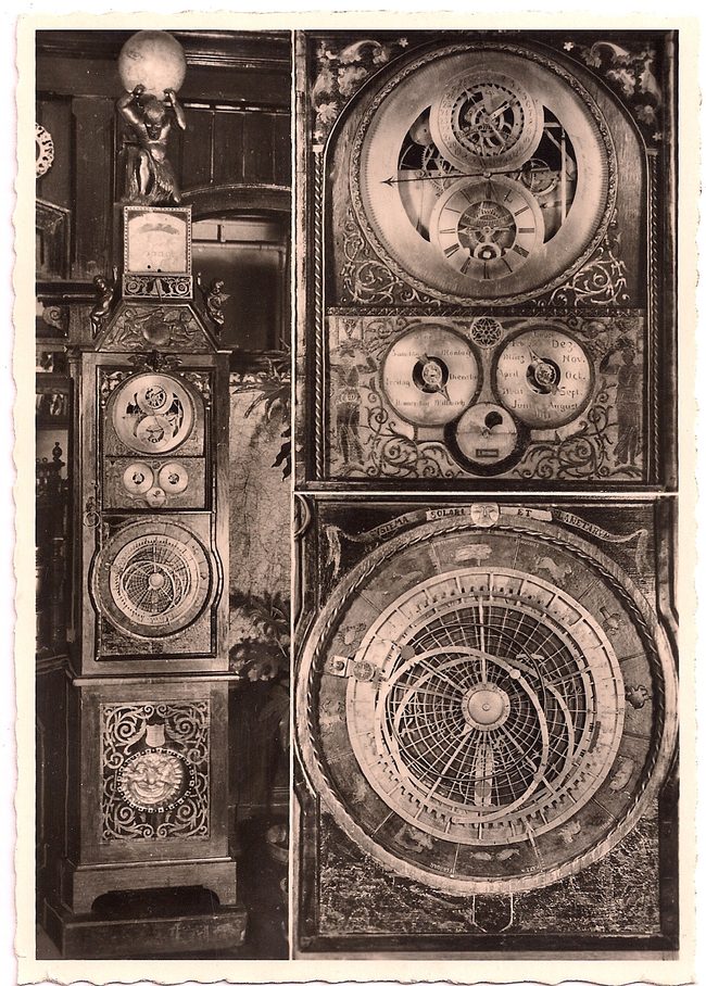 „Mit einem Aufzuge 600 Tage gehend, zeigt Stunden, Minuten, Sekunden, Wochentage, Monate, Datum, reguliert die Monatsdifferenzen selbsttätig (Schaltjahre), Sonnen- , Mond- und Stern-Auf-und Untergänge, Sonnenzeit, Mitteleuropäische- und Sternzeit, Mondphasen, Drachenmonat, Sonnen- und Mondfinsternisse, (deren Lauf durch die Sternbilder), die Zeit aller Länder der nördlichen Halbkugel, Berechnung der bewegl. Festtage, stündl. Glockenspiel“