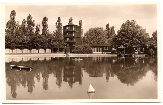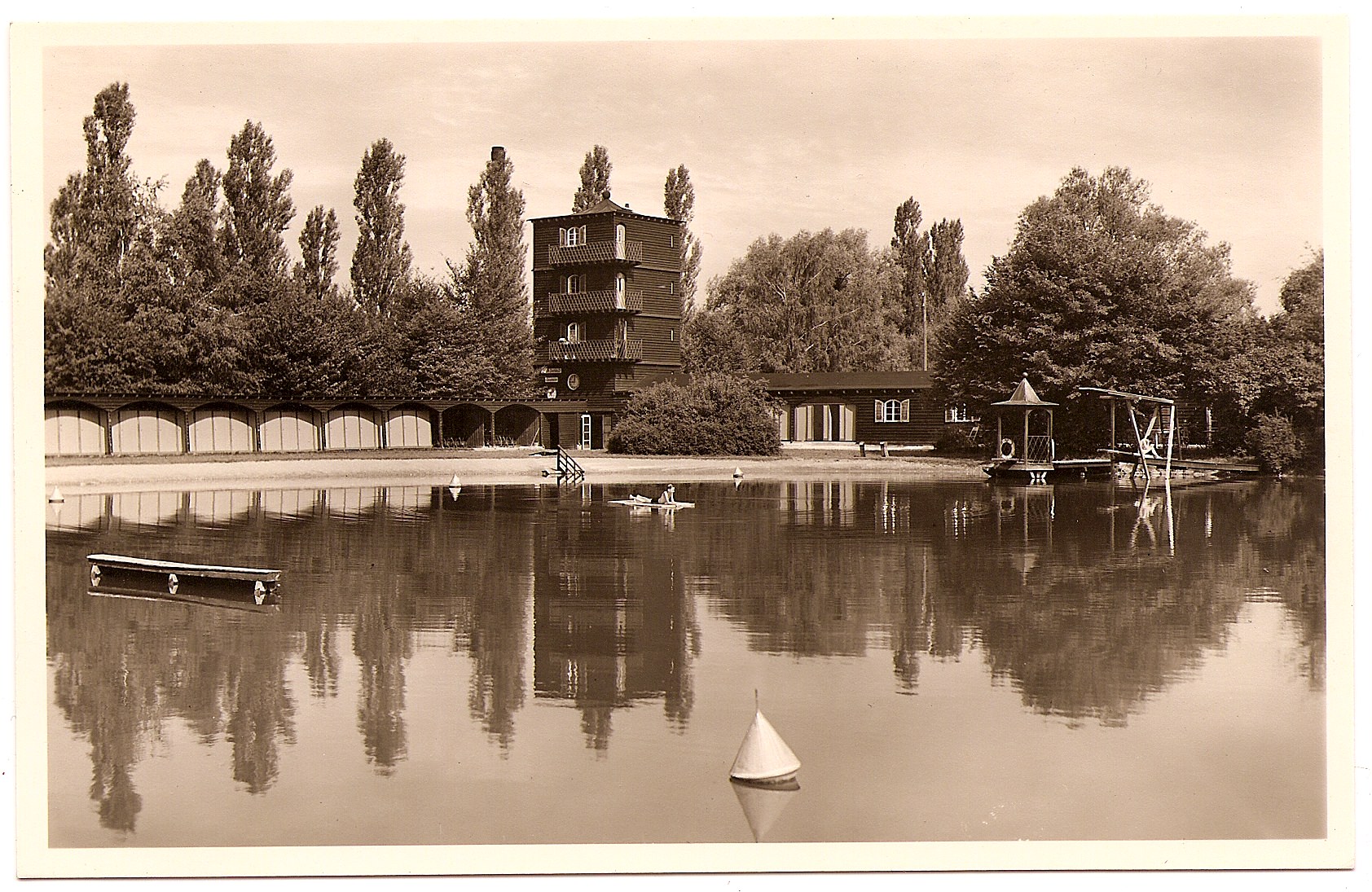Im vorderen, größeren Teil des Bades standen zwei Sprungbretter (1m / 3m). Das Startbrett (links) war Ausgangspunkt für das 50m-Schwimmen (= 1 Breite). Ziel war ein Steg rechts neben dem 3m-Sprungbrett. In der Mitte des Bades lagen ein paar mit Ketten befestigte Flöße. Rote Bojen kennzeichneten die Grenze des Nichtschwimmerbereichs. Kasse und Eingang waren am Holzturm.