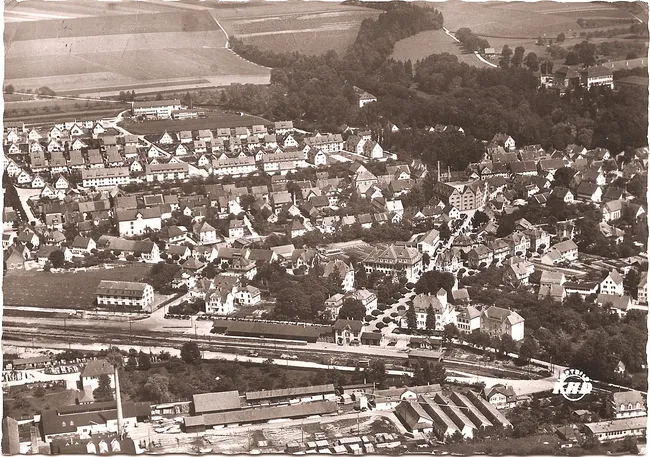 - links am Bildrand: die „Wies“, unser Spielparadies in der Kinderzeit (heute: Wohnbauten und „Aldi“)