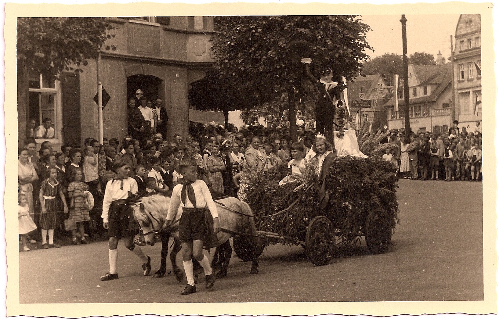 Fotokarte vom Kinderfest in Laupheim am 20. 07. 1953 (vgl. Rückseite). Ort: Ecke Mittelstraße / König-Wilhelm-Straße; Lebensmittelgeschäft Stumpp, heute: Schwäbische Zeitung / Eckpunkt-Mode.