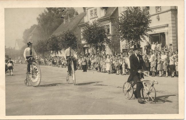 Auf dieser Fotokarte sehen wir einen Draisine-Fahrer und zwei Hochradfahrer beim Kinderfestumzug (etwa 1950).
