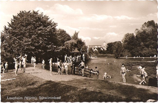 Zu dieser Postkarte erreichte uns folgende, hochinteressante Zuschrift des Laupheimers K.P.K., er berichtet:Sie fragen auf Ihrer - wirklich sehr gut gemachten - Seite der Laupheimer Ansichtskarten, ob jemand Informationen zu Ihren Bildern hat. Habe ich - denn der Junge auf dem Bild im Laupheimer Freibad bin mit grösster Sicherheit ich. Dafür spricht erstens, neben der frappierenden Ähnlichkeit, die an die Badehose angeklipste Nummern-Marke für die Umkleidebügel, was mir von meiner Mutter aufgetragen wurde um sie nicht zu verlieren - da war ich so ziemlich der einzige - und zweitens erinnere ich mich noch an einen Tag, an dem im Freibad fotografiert wurde -. mit einer Rollei oder Hasselblad, bei der der Fotograf “ganz komisch“ von oben durch den Sucher sehen musste.