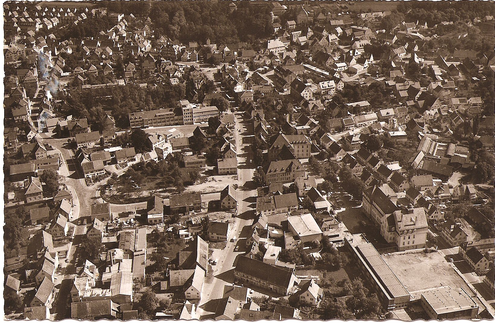 Hier ist das Rentschler-Gebäude in der Gartenstrasse sowie der Anbau der Anna-von-Freyberg-Grundsschule im Bau zu sehen. Bereits 1955 (vgl. Luftbilder im Buch von Rolf Müller) sind diese Gebäude fertiggestellt gewesen.