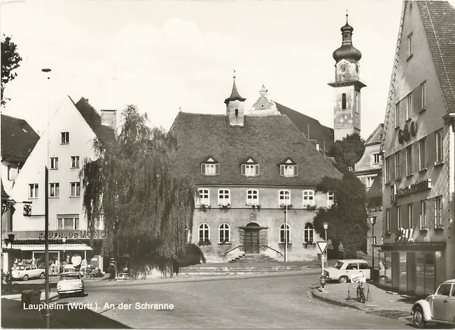 Das Gebäude links neben der Schranne hat 1954 noch den schönen Renaissance-Giebel. Umgeben ist es von einer mannshohen Mauer, und dahinter sieht man die typischen Kuhstallfenster. Die Hausecke ganz rechts gehört zum Gasthof zum Lamm. Auf der Karte von 1962 ist der Renaissance-Giebel zu einem Dreiecksgiebel umgebaut, und wo früher Kühe standen, ist nun das Kaufhaus MONOPOL mit einer Schaufensterfront.