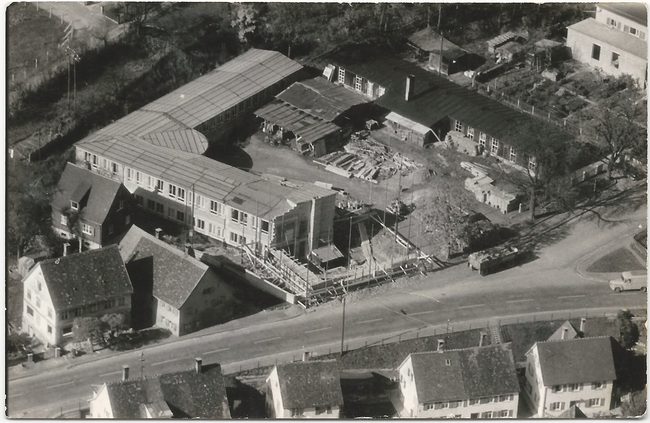Wir blicken von oben auf das Firmengebäude der Firma Fischbach und Miller, wo gerade der letzte Bauabschnitt fertiggestellt wird.