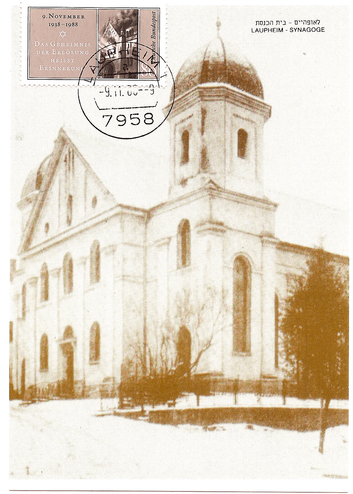 Anlässlich des 50. Gedenktages an die Reichskristallnacht (heute. Reichsprogromnacht) wurde die Karte in Haifa/Israel hergestellt. Gestempelt ist sie am 09.11.1988 in Laupheim (aber nicht abgeschickt). Angeboten wurde sie im polnischen eBay, wo sie Dominik für mich kaufte. Neun Tage später erhielt er Post von einem Herrn Isidore Baum aus Quebec/Kanada (Artikelstandort). Von Bielefeld kam dann die Karte zu mir nach Laupheim.